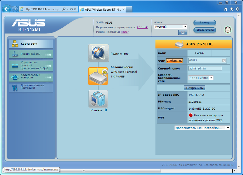 Веб-интерфейс настройки ASUS RT-N12 выглядит следующим образом: