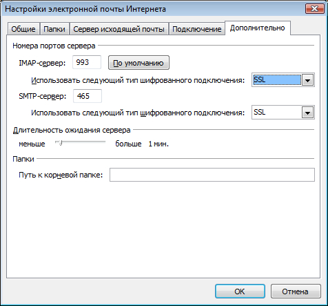7. на вкладке дополнительно укажите тип зашифрованного SSL-соединения. Если ваш интернет-провайдер блокирует порты, вы можете использовать дополнительные. Для подключения к почтовому серверу доступны следующие порты: