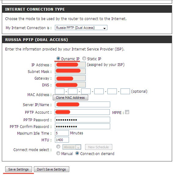 Выберите режим подключения — Режим подключения к сети Существует несколько вариантов: «Всегда — ❶ » — непрерывное подключение; «Подключение по требованию» — подключение к сети не по необходимости, т.е. Подключение к сети Когда мы выбираем подключение к Интернету, маршрутизатор автоматически подключается и отключается, если не соблюдено время, указанное в параметре «Максимальное время простоя». вручную — Подключение и отключение от сети осуществляется вручную. ручной — Подключение и отключение от сети осуществляется вручную.