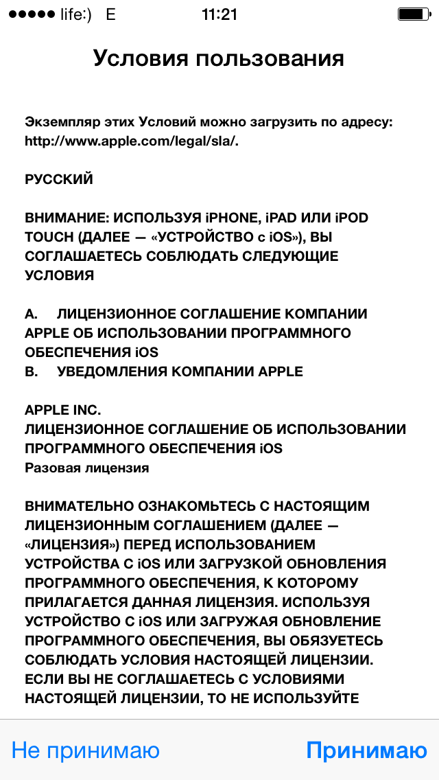 Далее вы должны согласиться с условиями использования и принять пользовательское соглашение. Вы не сможете завершить настройку и использование устройства, пока не примете соглашение. Лично я никогда не читал его и каждый раз слепо соглашаюсь со всеми условиями, я уверен, что 99% владельцев iOS-устройств делают это.