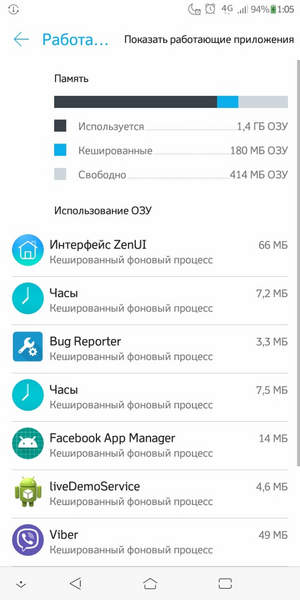 Переходим в подменю» Рабочие приложения». Здесь вы можете узнать, какие приложения запущены и сколько памяти они используют В верхней части экрана есть пункты «показать работающие приложения» и «показать процессы в кэше».» Первый пункт показывает, какая часть памяти передается системе, а какая под приложения, второй показывает, какие службы приложений находятся в кэше, что мы можем предотвратить без необходимости.» чтобы освободить память.