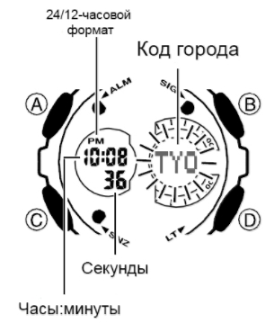 - Нажмите и удерживайте кнопку «A» [в левом верхнем углу] в течение примерно 3 секунд На цифровом дисплее мигает код региона, для которого установлено текущее время