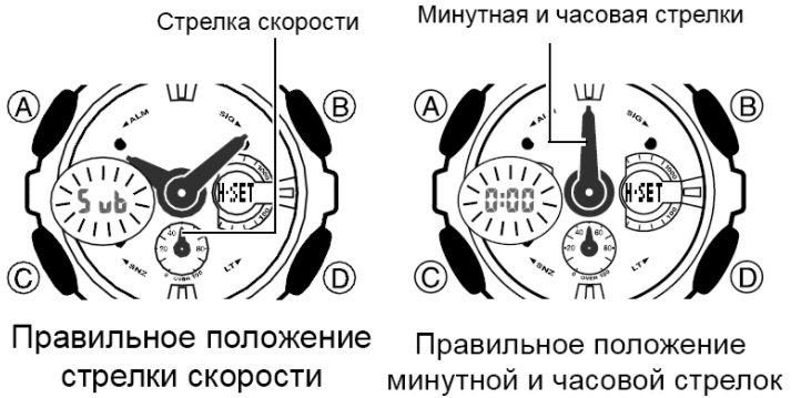 - Проверьте положение часовой и минутной стрелок — они должны находиться в положении «12 часов» Если этого не происходит, нажмите кнопки «D» и «B», чтобы переместить стрелки в нужное положение