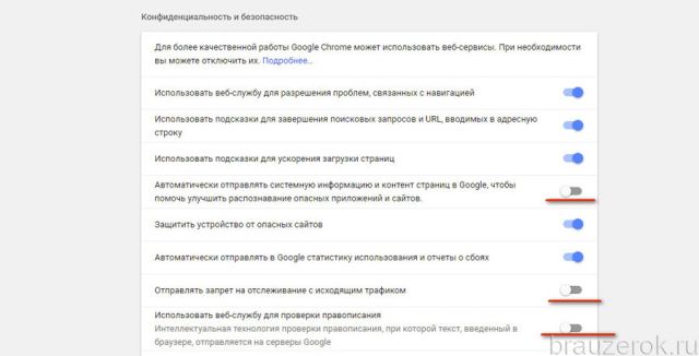 Первоначально отдельные опции могут быть активированы в соответствии с личными потребностями: «Автоматически отправлять …»- своего рода сотрудничество с Google. Если вы добавляете слайдер в эту строку, вы даете компании возможность получать данные о вашей системе и просматриваемом вами контенте.
