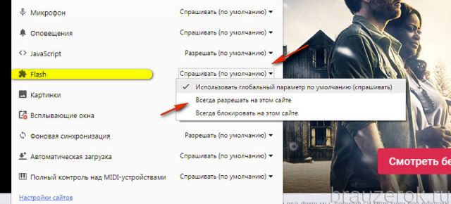 2. в строке «Flash» откройте список щелчком мыши и выберите значение «Всегда разрешать на этом сайте».