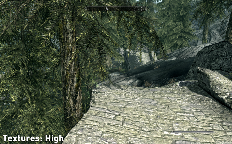 - На уровне «high» (высокий) объекты выглядят очень выраженными, так как FXAA, восьмикратное мультисглаживание и восьмикратная анизотропная фильтрация (анизотропная) активны одновременно, эти фильтры улучшают качество изображения и уменьшают размытость Трава и листья выглядят очень достоверно, как и объекты возле трактиров, пней, Камни и мосты выделяются своей реалистичностью, а поверхность земли (как ближняя, так и дальняя) приобретает более выраженные очертания Тень персонажа гораздо более разнообразна (поскольку ее разрешение увеличилось), остальная тень увеличилась до своей обычной длины Вода уже отражает все, а не только небо