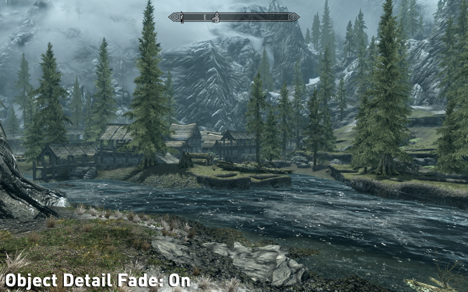 В ходе игры, запечатленной на приведенных выше фотографиях, мы видим большое количество различных объектов, густо разбросанных по всей длине дороги, на мосту и возле небольшой хижины вдалеке При установке минимального уровня (минимум, 1) появляются только объекты, расположенные поблизости: несколько грибов, книга, свиток и несколько бутылок с зельями На среднем уровне (Medium, 8) видны абсолютно все предметы, включая оружие, свитки и щиты, которые едва различимы на фоне амбара На максимальном уровне существенных изменений по сравнению с предыдущим изображением нет: все предметы так же видны и плохо различимы, но непрозрачность контуров скорее обусловлена их микроскопическим размером на таком хорошем расстоянии