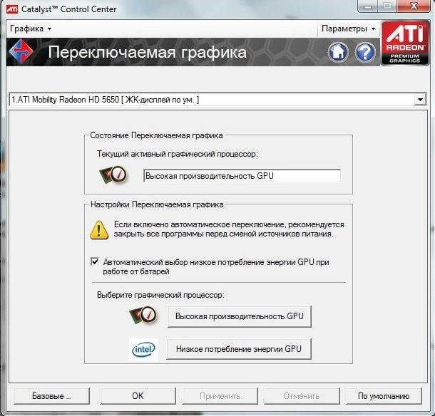 Переходим на вкладку «Power» (Питание). В правой части окна есть несколько разделов, в которых предлагается выбрать, что использовать: Высокопроизводительные (дискретные) или маломощные (встроенные в процессор) графические ускорители.