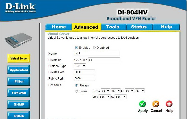 5. теперь вы можете идти к настройке Работа видеорегистратора через интернет . Наш регистратор использует порты 80 и 8000. Порт 80 — это порт HTTP, который многие устройства используют для доступа к своим веб-интерфейсам. Измените его, чтобы избежать конфликтов в настройках К регистратору 81. Если в сети несколько DVR или IP-камер, можно назначить следующие 82,83 и т.д. Порты и другие и последующие регистраторы должны изменить номера других портов. Мы регистрируем порты 804 и 81 в виртуальном сервере маршрутизатора D-Link DI-8000hv.