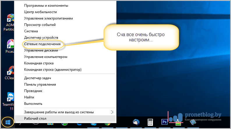 В дальнейшем все будет показано на примере Win 10, хотя и в предыдущих версиях этой операционной системы все сделано аналогично. Поэтому мы продолжаем. Щелкните правой кнопкой мыши на кнопке «Пуск», а затем выберите раздел «Сетевые подключения»: