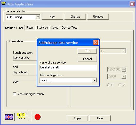 स्थिति/ट्यूनर टैब पर, जहां डेटा अभी के लिए केवल उपग्रह के लिए वर्तनी है интернета , समाचार बटन पर क्लिक करें और डेटा सेवा विंडो के नाम पर, उपग्रह का नाम दर्ज करें, उदाहरण के लिए, «Eutelsat Sesat» और ठीक पर क्लिक करें।