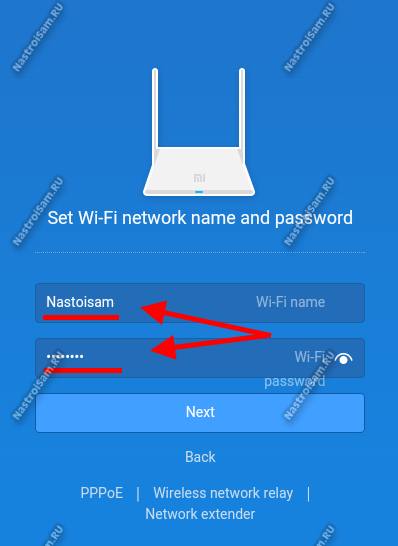 2 Далее необходимо задать имя сети Wi-Fi и пароль для нее. Пароль должен состоять не менее чем из 8 символов. Поскольку маршрутизатор двухдиапазонный, пароль для сети одинаков на обеих частотах. Это можно изменить позже на панели управления. Мы продолжаем настройку .