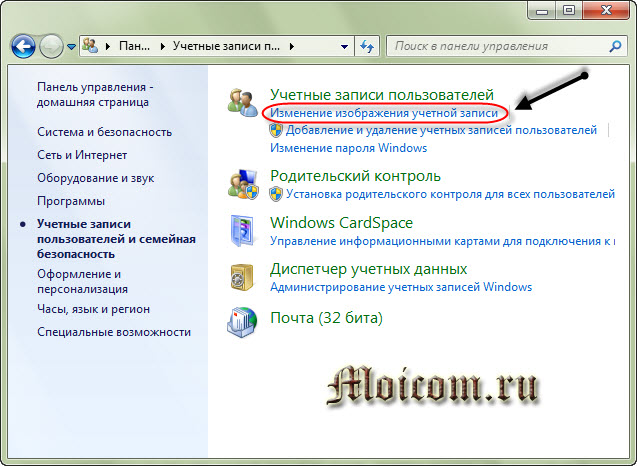 Чтобы просмотреть или изменить изображение своей учетной записи, необходимо снова перейти в меню Пуск >>> Панель управления >> Учетные записи пользователей и семейная безопасность >>> Учетные записи пользователей >>> Изменить изображение учетной записи.