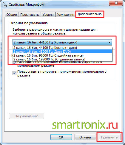 Переключитесь на вкладку Advanced и выберите нужную битовую глубину и частоту дискретизации из выпадающего списка
