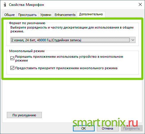 Следующая вкладка и#8220;Дополнительно” это больше для настройки студийного микрофона. На нем можно установить частоту дискретизации и количество каналов, используемых в микрофоне.