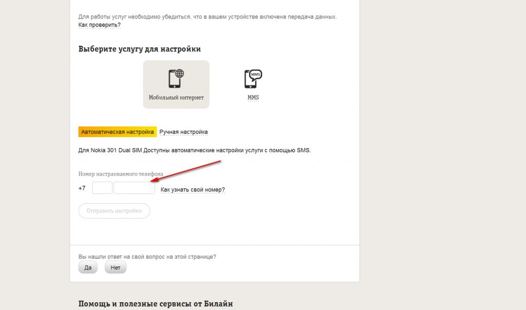 - Если ваша модель телефона Позволяет отправить вам SMS с настройками, а затем ввести свои мобильный номер «Билайн» (через некоторое время приходит SMS — принимаем, сохраняем полученное настройки и перезагружаем телефон ).
