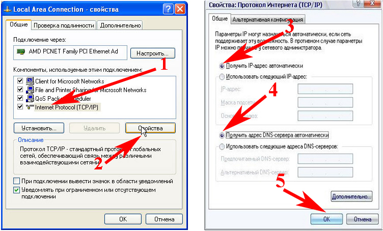 После этой процедуры откроется следующая категория, где вы уже выберите пункт для получения IP-адреса и автоматического получения адреса DNS-сервера. Подтверждаем свои действия, как и прежде, с помощью кнопки «OK», которая находится внизу окна.