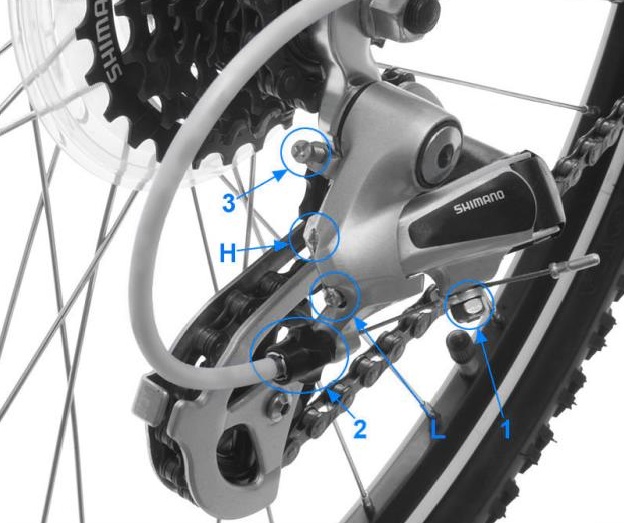 Следующим этапом подготовительных работ будет перевод велосипедной цепи таким образом, чтобы она попала на звезды наименьшего диаметра как спереди, так и сзади. Для этого вам необходимо найти на переключателе Регулировка винта с метками: h (high) и L (low) Его назначение — регулировка программ большого и малого диапазона Здесь нужен винт под литерой «L», чтобы согнуть максимальное значение
