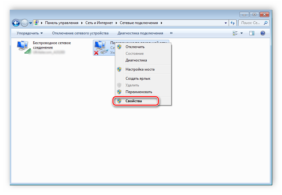 - Щелкните правой кнопкой мыши на значке подключения в локальной сети и выберите Свойства