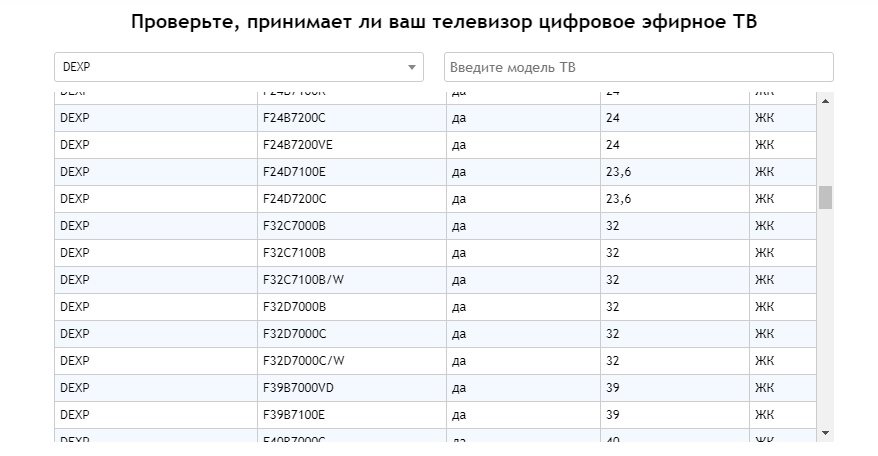 Сначала мы проверяем, поддерживает ли он ваш телевизор DVB-T2, так как этот формат используется для вещания цифрового телевидения на территории Российской Федерации. Эта информация может быть раскрыта из инструкции Ваш телевизор, проверьте паспорт изделия внутри, в нем должна содержаться эта информация. Есть и другой способ использования Интернета, для этого заходим на страницу посмотреть рисунок Российской Федерации. Здесь мы находим элемент проверки, если он принимает ваш телевизор Предложите цифровое телевидение, марку и модель телевизора и проверьте, хотите ли вы получить номер.