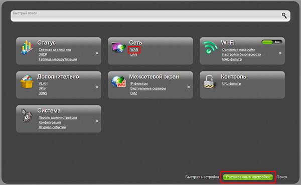Введя имя пользователя и пароль, мы попадаем на главную страницу панели управления настройками маршрутизатора. Панель конфигурации маршрутизатора может иметь другой вид в зависимости от модификации оборудования и текущей прошивки. После этого нужно перейти по ссылке «Дополнительные настройки» внизу.