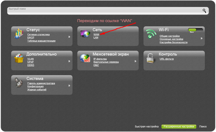 На открывшейся странице находим раздел «Сеть» и переходим по ссылке «WAN».