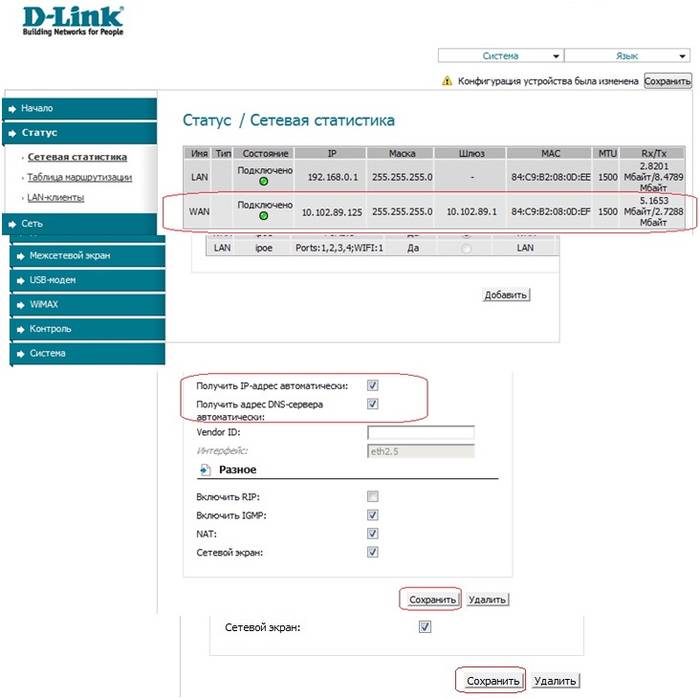 После ввода нажмите на кнопку «Сохранить» Мы вернулись на страницу с конструкциями, последняя из которых просто построена, которые, как нам показали, являются «разорванными».»»С правой стороны вы увидите дисплей, указывающий, что настройки маршрутизатора были изменены и теперь должны быть сохранены.»»» Это необходимо сделать — иначе при перезагрузке или выключении роутера все настройки будут стерты Обновите страницу списка подключений Если вы все настроили правильно, не перепутав пароль или тип подключения, он загорится зеленым цветом, и интернет станет доступен