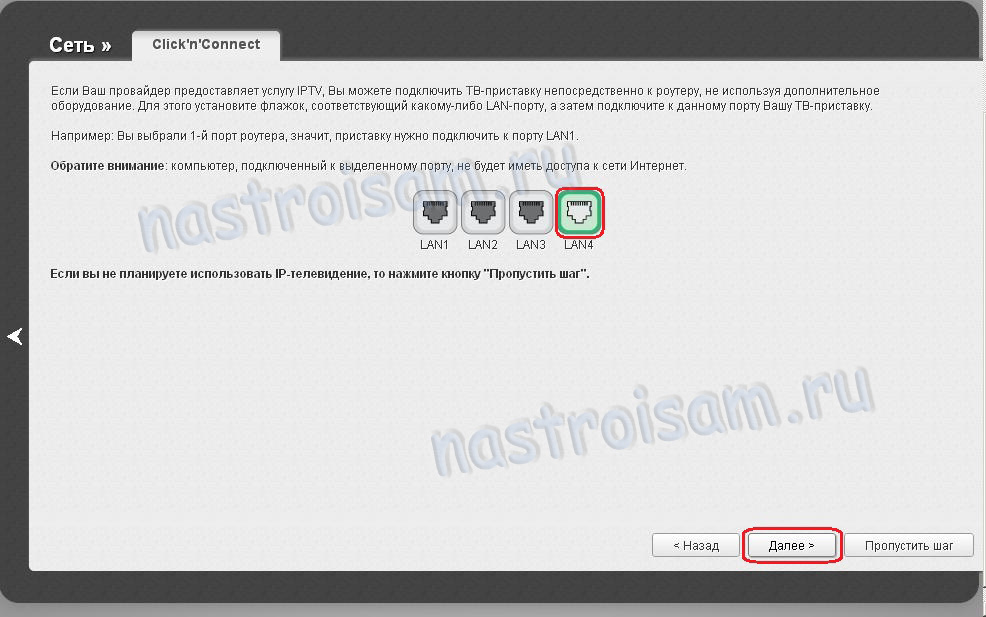 Выберите порт для настроек приставки и нажмите Далее. Примечание: Этот параметр настройки IPTV подходит только в том случае, если провайдер IPTV не использует VLAN. В противном случае — используйте эту инструкцию — ссылка.