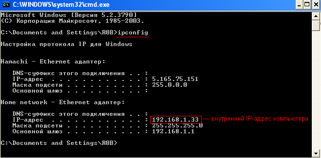 После этого следующая программа отобразит основные данные о сетях, к которым подключен компьютер. Внутренний IP-адрес соответствует строке IP-адреса в блоке «Адаптер домашней сети Ethernet: «.