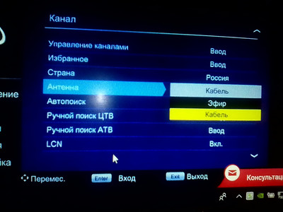 В пункте Антенна необходимо выбрать желаемый формат вещания Кабель или Эфир.