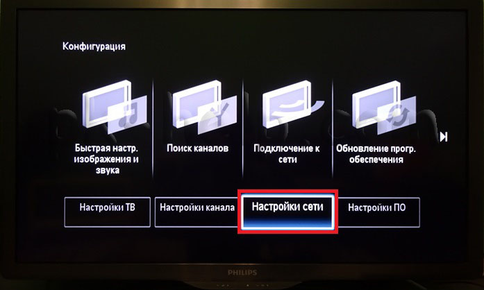 Если вы столкнулись с проблемой при настройке Smart TV на телевизоре Philips, сначала проверьте сетевую конфигурацию телевизора. Для этого зайдите в меню (кнопка «Home» на пульте ДУ) и перейдите в раздел «Конфигурация» — » Настройки сети».
