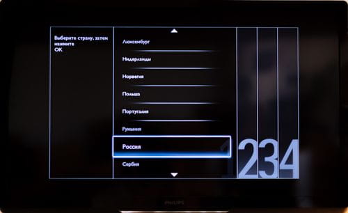 - Затем пользователь должен выбрать страну. Сначала необходимо внимательно осмотреть заднюю панель телевизионного приемника, где находится наклейка со списком стран, в которых, по данным Philips, транслируется цифровое телевидение. Если Российская Федерация отсутствует в списке, рекомендуется отметить одну из стран Западной Европы, предпочтительно Германию или Финляндию.