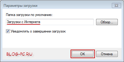 В разделе Общие нажмите кнопку Обзор и в появившемся окне найдите нужный файл. папку (в моем случае папку Загрузка из Интернета на локальный диск E). Нажмите OK в этом окне и OK еще раз в настройках, чтобы сохранить изменения: