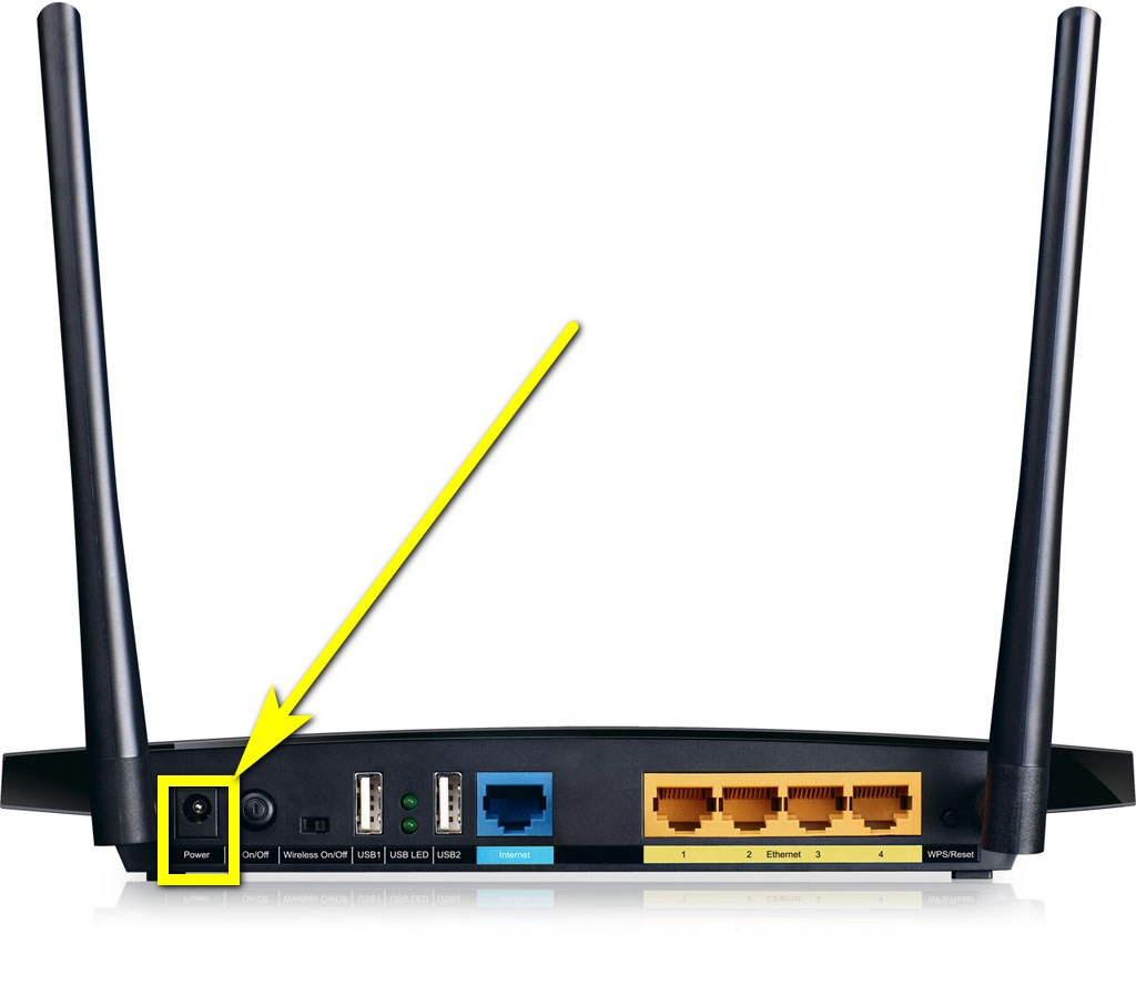 3. блок питания остается от роутера в настенную розетку. Некоторые устройства имеют кнопку отключения питания, которую не следует забывать активировать. Маршрутизатор будет заряжаться в течение нескольких минут.