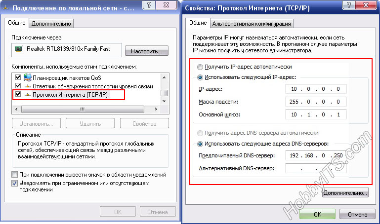 Windows XP — и#171;Пуск» > «Панель управления» > «Сетевое подключение» > выделите «Подключение по локальной сети» > и в правом меню «Просмотр состояния подключения» > нажмите кнопку .#171;Свойства» >Выберите « Протокол Интернета TCP / IP» и нажмите кнопку .#171;Свойства».