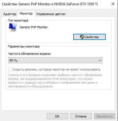 - На вкладке «Монитор» нового окна поставьте галочку напротив «Скрытые режимы» и выберите нужную частоту обновления.