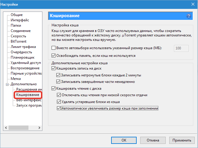 По умолчанию uTorrent автоматически определяет размер кэша. Если в строке состояния отображается сообщение о перегрузке. диска , необходимо попытаться изменить значение громкости и одновременно отключить нижний параметр «автоматический». Увеличьте » и активируйте верхнюю часть, которая составляет примерно одну треть от размера вашей оперативной памяти. Например, если ваш компьютер имеет 4 ГБ оперативной памяти, вы можете указать размер кэша около 1500 МБ.