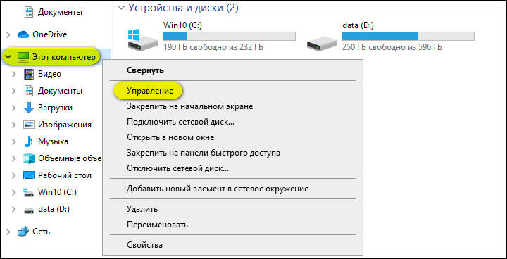 Если на рабочем столе в Windows 10 нет значка, откройте проводник и слева найдите его аналог. Нажмите правую кнопку мыши и выберите пункт Управление: