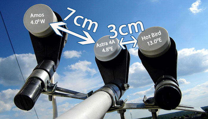 Мы фиксируем головку, которую принимает Amos, слева от центральной головки (если смотреть сзади антенны) на расстоянии около 7 см и чуть больше, справа головка, которую принимает Hot Bird, находится на расстоянии около 3 см от центральной головки и чуть ниже ее.