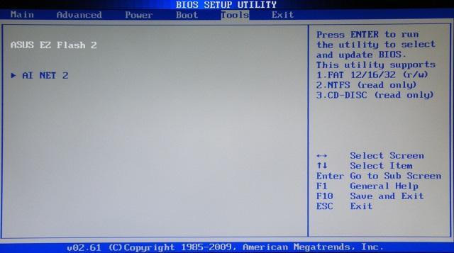 Вкладка Extras необходима для обновления BIOS с дискеты или флэш-диска (пункт «Asus EZ Flash») и для отображения информации о кабеле, подключенном к сетевой карте (пункт «AI net»).
