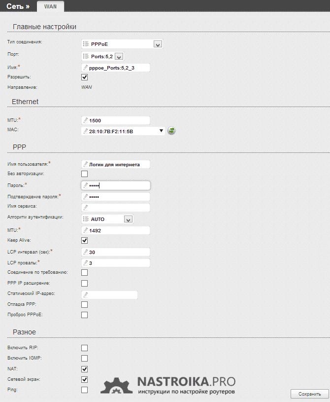 На странице расширенных настроек, в пункте «Сеть», нажмите на «Wan «. Откроется список соединений, где есть только одно — нажмите на него и на следующей странице нажмите на «Delete «. Вы вернетесь к пустому списку соединений, нажмите на «Add » и введите следующие параметры для интернета ⑦ :