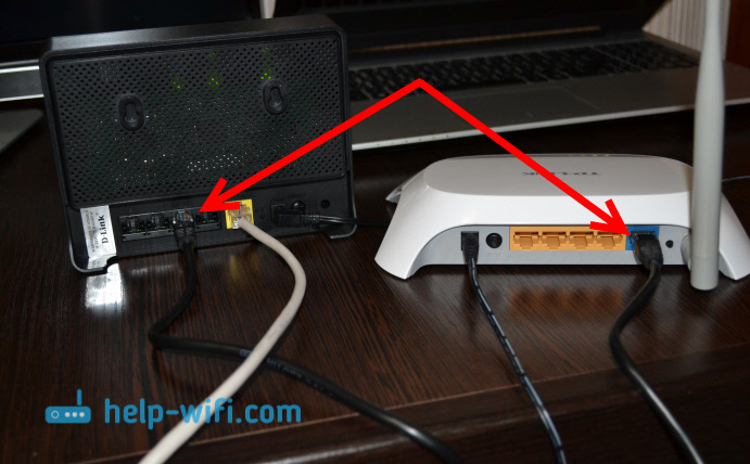 Я покажу на примере подключения маршрутизатора TP-Link к D-Link (это наш основной и черный). Итак, мы берем один кабель и подключаем его к порту LAN на главном маршрутизаторе (в одном из четырех, если у вас их 4). А на втором маршрутизаторе мы подключаем кабель к порту WAN. См. скриншот ниже. Мои маршрутизаторы соединены черным кабелем. Белый кабель — это интернет, подключенный к главному маршрутизатору.