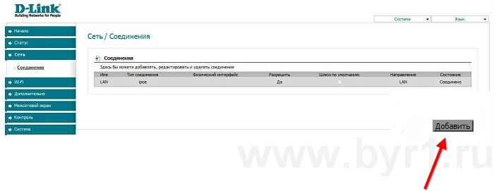 Теперь вам необходимо создать настройку ADSL-соединение. Для этого вам понадобятся данные настройки Сети, предоставляемые вашим провайдером (они указаны в договоре или в службе поддержки). Затем перейдите к пункту «Сеть», выберите под пунктом «Подключения» и нажмите на кнопку «Добавить