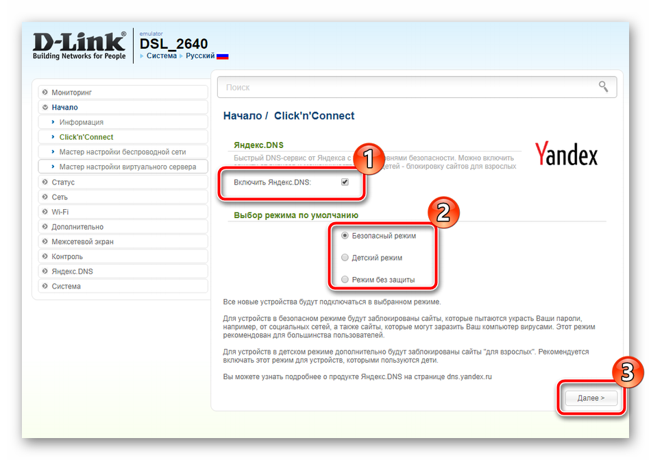 D-Link предлагает пользователям возможность включить DNS от Яндекса Используя сервис, вы можете организовать безопасную систему для защиты от нежелательного контента и вирусов В открывшемся окне содержится краткое описание каждого режима. Поэтому прочитайте их, поставьте отметку напротив соответствующего и продолжайте