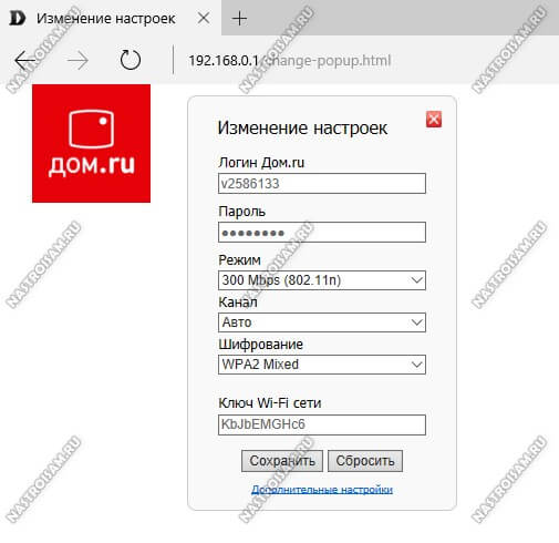 Как видите, пользователю предлагаются редкие варианты для настройки роутера Дом ру. Вы можете изменить только имя пользователя и пароль для выхода в Интернет и основные параметры беспроводной сети — режим, канал, шифрование и пароль по Wifi. Чтобы изменения были применены — нажмите кнопку .#171;Сохранить»,