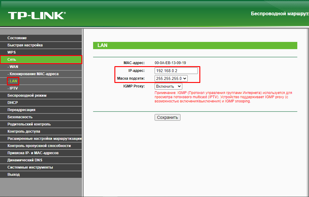 Перейдите в раздел Сеть — LAN. Проверьте параметр маски подсети — если его значение равно 255.255.255.0, IP-адрес должен быть изменен по следующему принципу.