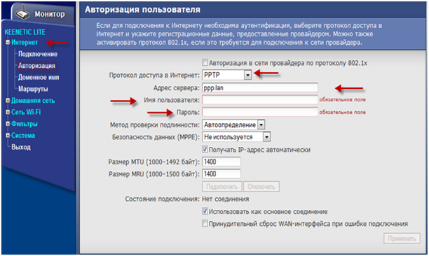 Этот тип подключения использует интернет-соединение через VPN-сервер в дополнение к паролям и логинам. Для настройки Перейдем в пункт меню «Интернет» и выберем из списка «Авторизация».