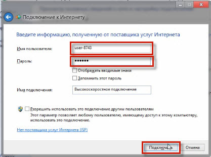 Последний шаг — ввод данных, указанных в договоре с провайдером. Вы должны знать свое имя пользователя и пароль, которые предоставляются провайдером в качестве идентификационных данных. Введите необходимую информацию, введите имя для нового соединения и нажмите Подключить.