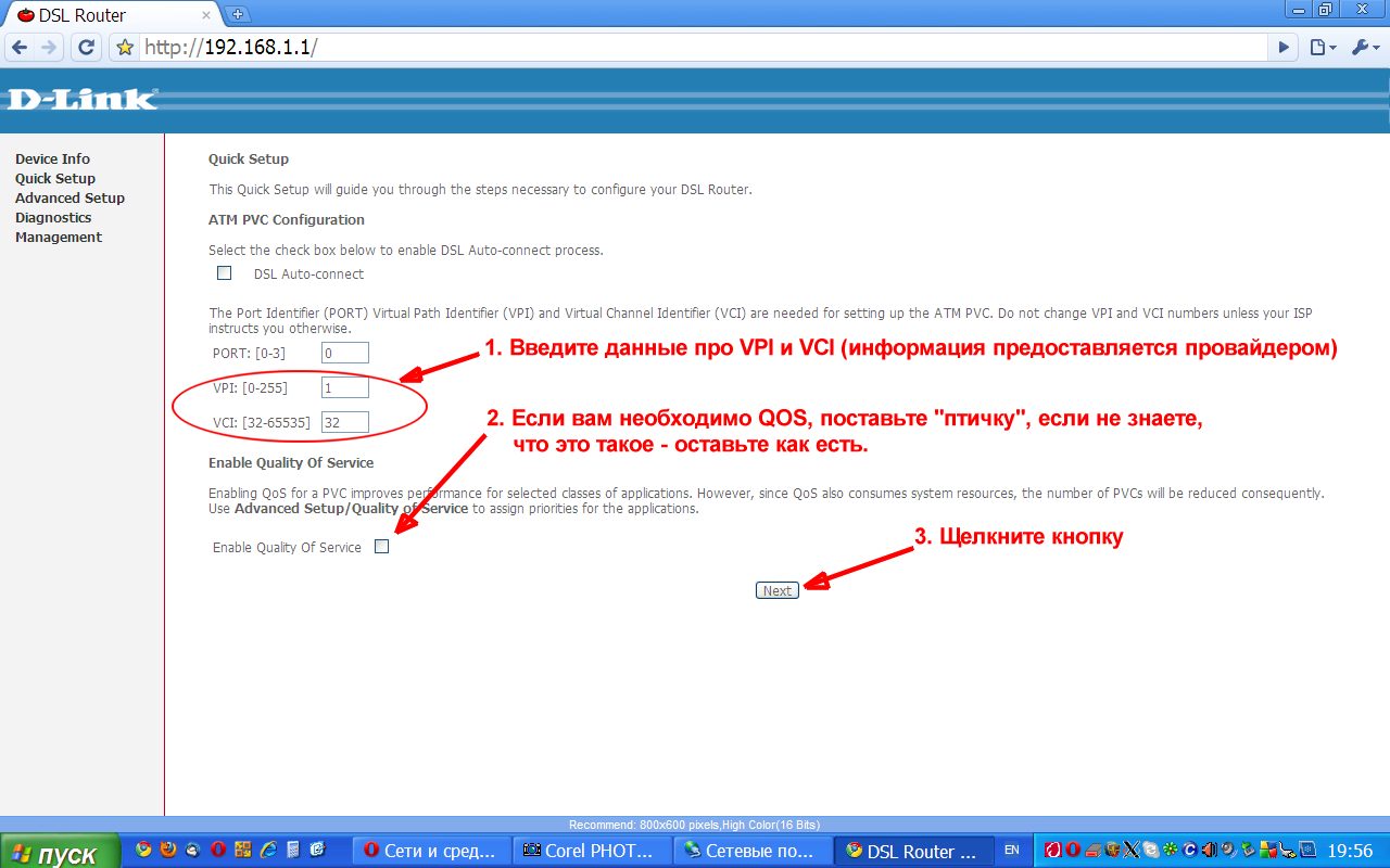 Сначала, и это необходимо, нужно ввести значения VPI и VCI. Обратите внимание, что если параметры введены неверно, ваш модем не сможет подключиться к провайдеру. Поэтому будьте осторожны. Как и ранее «вводная… «В данном примере используются значения VPI — 1 и VCI — 32, и я обратился к этим значениям, что показано на скриншоте на рис. 11. (Кстати, значения VPI и VCI, использованные в данном примере, реальные, это параметры сети моего провайдера ukraelecom). В вашем случае введите значения VPI и VCI, предоставленные вашим провайдером.