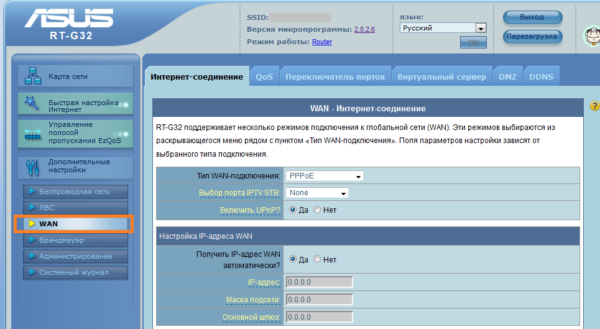 - На странице настроек Asus RT-G32 выберите «WAN» в меню слева. Откроется страница настроек подключения к Интернету.